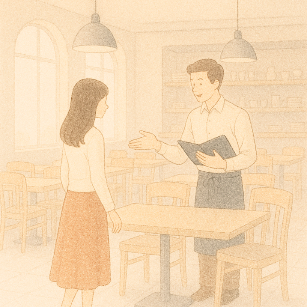 お店に入ったときにまず交わす基本のやり取りです。